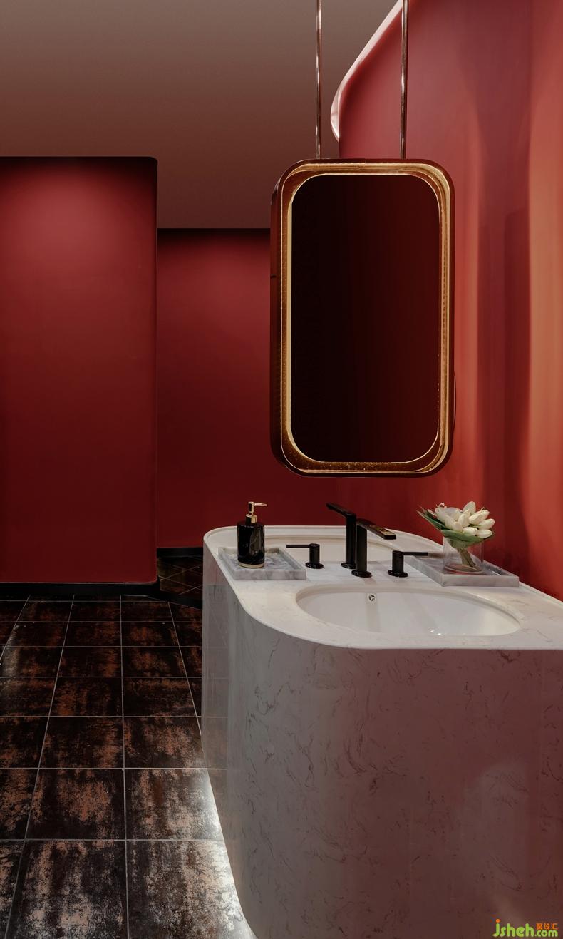 沿著過道繼續(xù)往前走,設(shè)計師在這里打造了一個別具一格的衛(wèi)生間,鮮艷的紅色,同時與外面的白色和黑色形成了強烈的色彩碰撞,深圳餐廳設(shè)計充滿了激情和活力,激發(fā)無限的想象力與視覺感受。