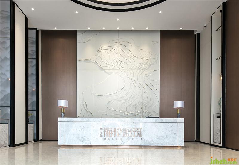 接待區(qū)背景墻是一面巨幅藝術(shù)浮雕,不規(guī)則的線(xiàn)條肌理抽象地呈現(xiàn)出梯形山野田園的意象。雅鉑白大理石,有著山水云霧般的紋理,白潤(rùn)如玉的色澤,給觀者以?xún)?yōu)雅穩(wěn)重、柔和舒適的視覺(jué)感。裝修設(shè)計(jì)