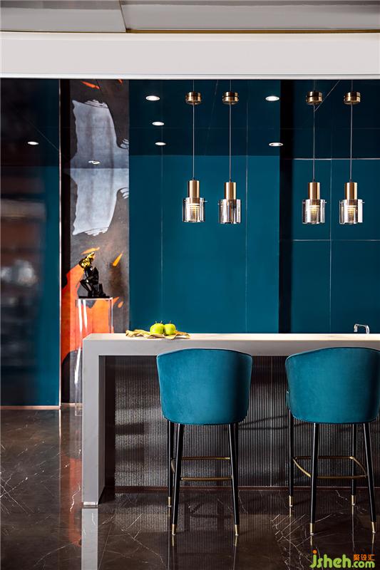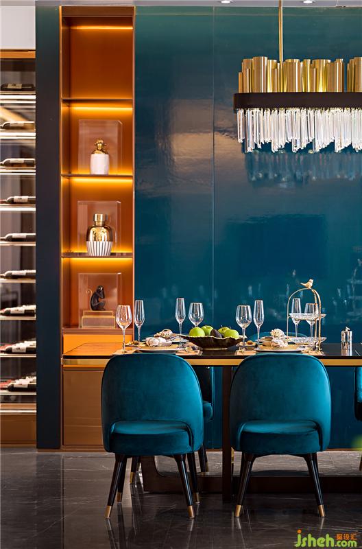 整個(gè)會(huì)所空間以藍(lán)、金主色調(diào)為主,出挑的造型設(shè)計(jì)精心演繹著當(dāng)代的輕奢時(shí)代生活。在整體深色基調(diào)中通過(guò)細(xì)膩的質(zhì)感和色彩上的對(duì)比,玻璃與金屬的運(yùn)用,表現(xiàn)出空間的品質(zhì)感。空間嚴(yán)謹(jǐn)?shù)闹剖?,地面古堡灰大理石,加入濃烈大膽的美人蕉橙和?nèi)斂的搪瓷藍(lán)沖突碰撞,營(yíng)造極致的視覺(jué)體驗(yàn)和極具張力的空間感受,如葡萄酒般濃烈、熱情、優(yōu)雅、浪漫、精致、排場(chǎng),生動(dòng)巧妙地并置。而藝術(shù)畫(huà)的點(diǎn)綴更進(jìn)一步增強(qiáng)了空間的時(shí)尚感與藝術(shù)感。會(huì)所設(shè)計(jì)