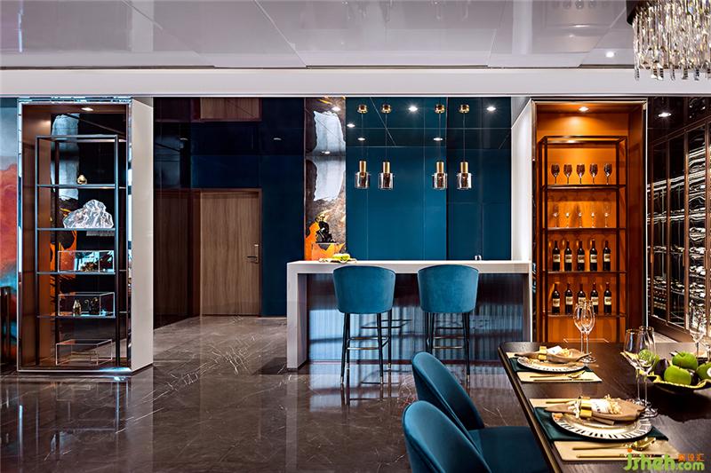 本案在強(qiáng)調(diào)精英品味的同時(shí),更看重空間的舒適性。在空間布局上,設(shè)計(jì)師有意識(shí)地將會(huì)客主題貫穿整個(gè)空間,以序列、框柜、藝術(shù)、色彩等組合形式進(jìn)行布局,在優(yōu)雅貴氣與生活美學(xué)之間尋求平衡,盡量去減少空間的拘束感。同時(shí),通過(guò)不同材質(zhì)的渲染與點(diǎn)綴,對(duì)大理石、金屬、烤漆等材質(zhì)綜合運(yùn)用,表現(xiàn)出不同的節(jié)奏。將葡萄酒收藏柜、鏤空藝術(shù)架、餐臺(tái)、酒吧臺(tái)等設(shè)計(jì)元素以流暢的律動(dòng)進(jìn)行串聯(lián),使空間的各個(gè)區(qū)域恰到好處地融合在一起。會(huì)所設(shè)計(jì)