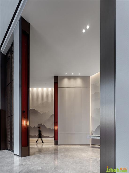 水墨畫是中國特有的繪畫藝術形式,主要以水和墨為繪畫原料,以筆法為主導,以墨為色,通過墨的濃淡變化來體現(xiàn)色彩的層次變化。本案的設計靈感正是來源于傳統(tǒng)水墨畫,EHOO易虎設計以"筆墨紙硯”為元素提點,借鑒筆墨丹青藝術的表現(xiàn)手法,融合現(xiàn)代山水畫卷里的文人詩意情懷,呈現(xiàn)極具東方氣質的空間妙境。銷售中心設計
