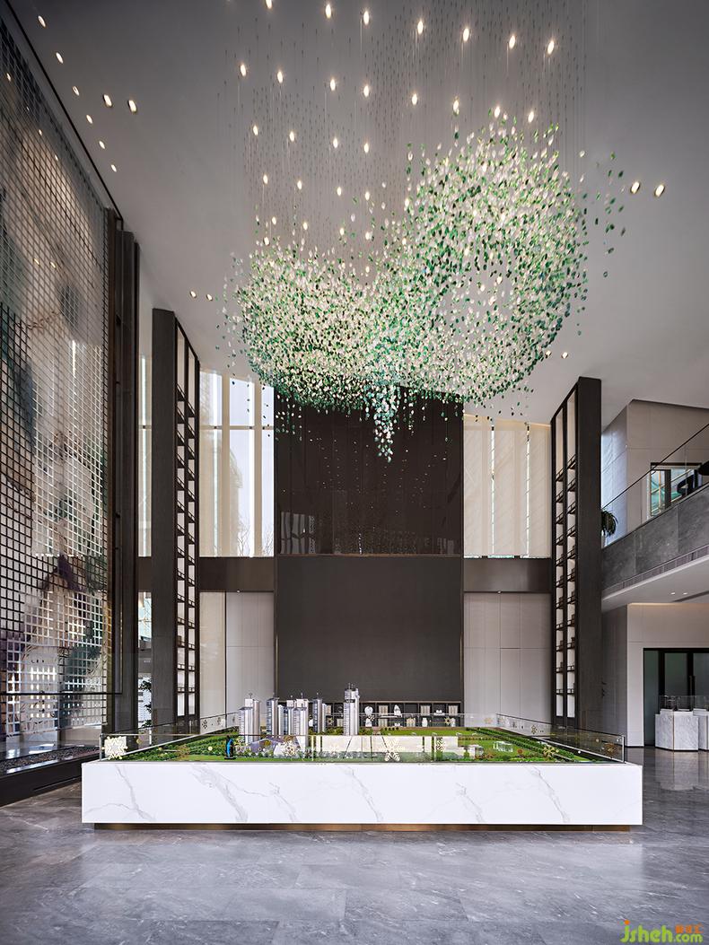 沙盤區(qū)藝術(shù)吊飾由上萬顆不規(guī)則的琉璃石子制成,融入當(dāng)代藝術(shù)之美,綠白相間,銷售中心設(shè)計疏密有致,如煙雨入江南,清新自然的氣息撲面而來。巨幅藝術(shù)裝置上的現(xiàn)代寫意山水,從高處飛流直下,氣勢恢宏。