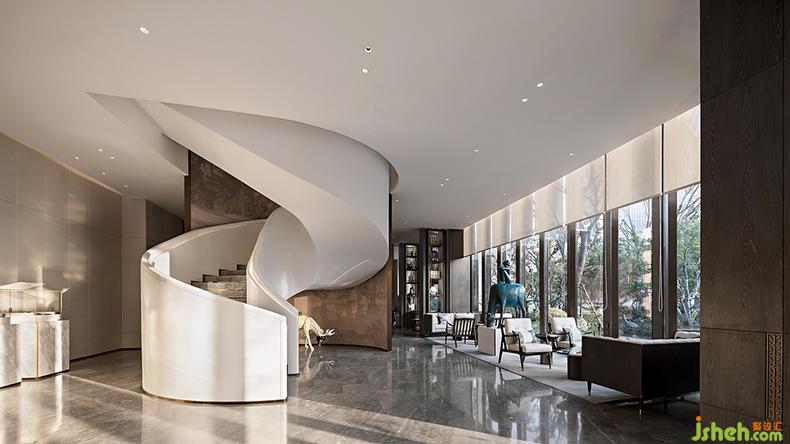 海螺形的旋轉(zhuǎn)樓梯,有著柔美的弧形曲線,極簡的純白色,與天花融為一體,銷售中心設(shè)計銜接上下兩個空間,既滿足了功能的需求,又展現(xiàn)出現(xiàn)代藝術(shù)的格調(diào)。