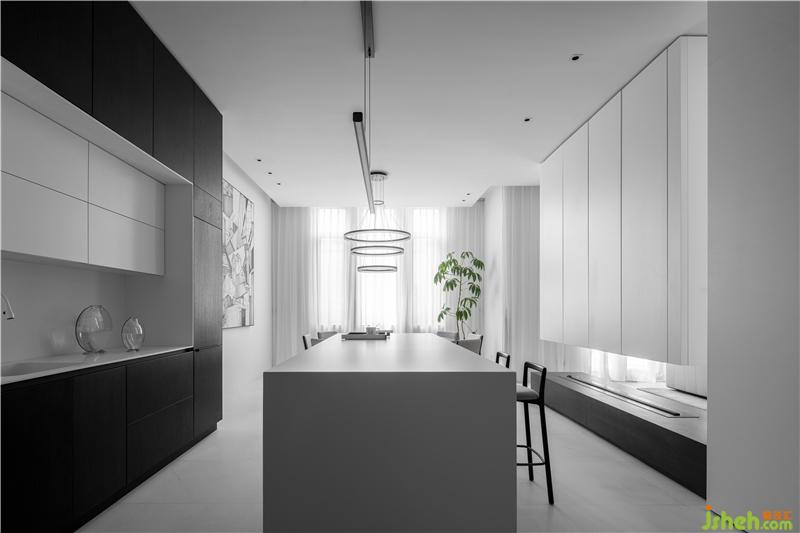 建筑的情調(diào)伴隨著光和影而發(fā)生,人生亦然。設(shè)計(jì)師將光作為第一設(shè)計(jì)要素,賦予空間更多的時空變化,最大限度地汲取自然的精華。客廳與餐廳的設(shè)計(jì)強(qiáng)調(diào)空間的連續(xù)性,追求設(shè)計(jì)的極簡與極奢,也滿足了生活日常的整潔需求。電視背景的超大柜體結(jié)構(gòu),既強(qiáng)化了空間的秩序,又提升了空間的氣質(zhì),也大大增加了收納的實(shí)用空間。