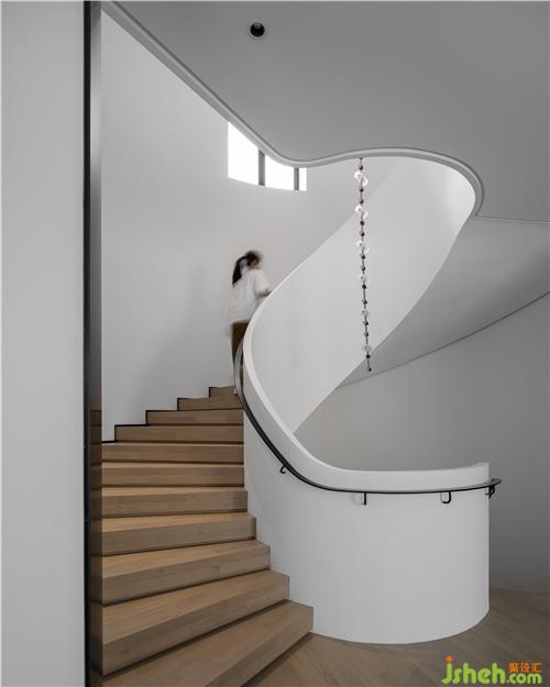 延伸向下的挑高空間,木色與白色墻體的碰撞。