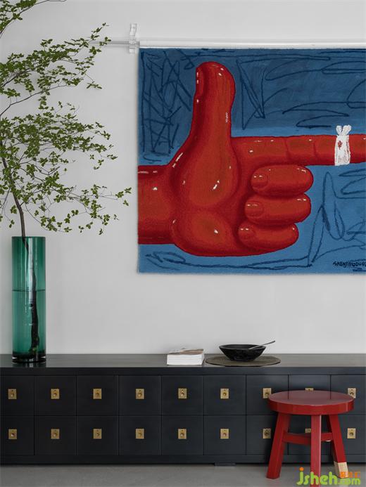 邊柜的造型是老式中藥鋪的草藥柜模樣,只一眼便仿佛聞到了中草藥的獨(dú)特氣味。其上也裝飾著同系列的復(fù)古感陶瓷容器。別墅裝飾墻上的高對比度的藍(lán)紅色明麗畫作充滿的抽象的西方現(xiàn)代時尚之感,而充滿中式鄉(xiāng)村復(fù)古氛圍的紅色的木頭小圓凳與畫完美呼應(yīng),不同的文化元素相撞卻產(chǎn)生了極度和諧的效果。