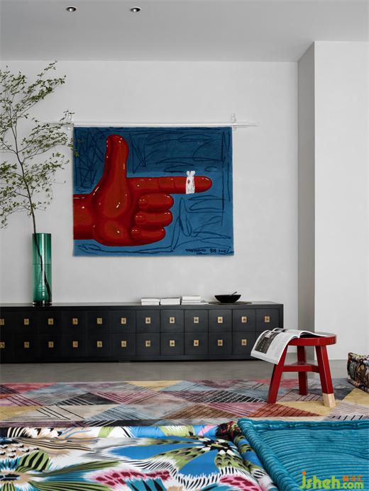 高飽和度的幾何圖形掛畫,墨綠色的沙發(fā),紅色的可愛兔子座椅,莫蘭蒂色地毯,別墅裝飾使靜態(tài)的極簡之家充滿靈動的藝術(shù)時尚感。