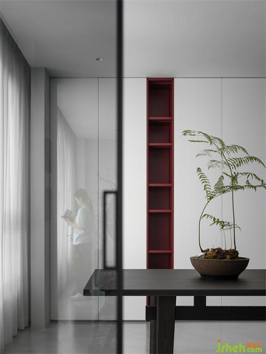書房以大玻璃門與客廳連通,詮釋著打破局限阻隔,開放自由的概念。別墅裝飾在純白柜門中紅色的鏤空,給黑白灰為主色的茶室增添一抹明亮愉悅的色彩。