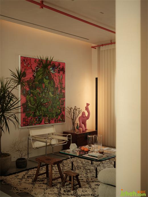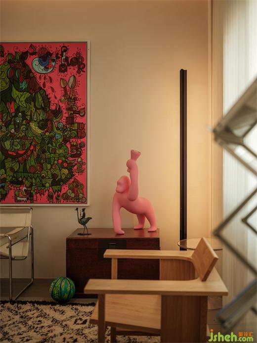Bright and cheerful colors form a jumping rhythm in the pure white space. The sun rises in the east and sets in the west, and the indoor light changes with time and season. Light and shadow shake gently on the gauze curtain, and the passage of time forms a dynamic aesthetic feeling in the room.