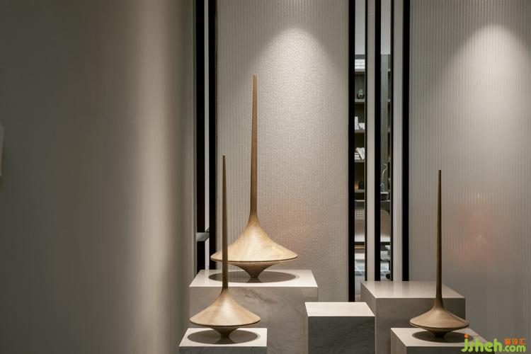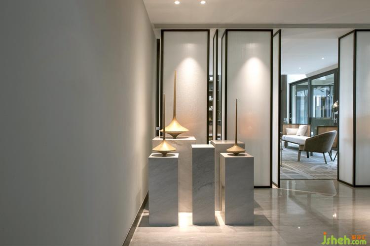 過(guò)廳肌理獨(dú)特的藝術(shù)烤漆玻璃墻搭配現(xiàn)代前衛(wèi)的吊燈,室內(nèi)設(shè)計(jì)師將穩(wěn)重深沉的理性之美滲透于細(xì)部,呈現(xiàn)帶有多年歲月積淀的睿智優(yōu)雅。