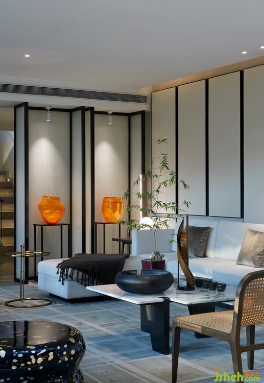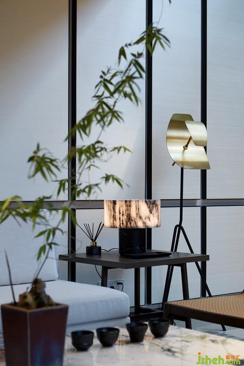 穿過屏風進入餐廚區(qū)域,深木色的廚房空間更像一個藏風聚氣的藝術(shù)館,室內(nèi)設(shè)計師以一種低調(diào)的靜默,達至分明的藝術(shù)性指向。無論是陳列柜上的藝術(shù)品還是藝術(shù)玻璃繪制的巨幅山水畫,都增強了空間內(nèi)在的人文厚度。餐廳吊燈自下而上緩緩而升,提升了垂直方向上的視覺體驗。墻面如葉子般輕輕飛舞的藝術(shù)裝置,鋪設(shè)出曲動飛揚的神采風韻。