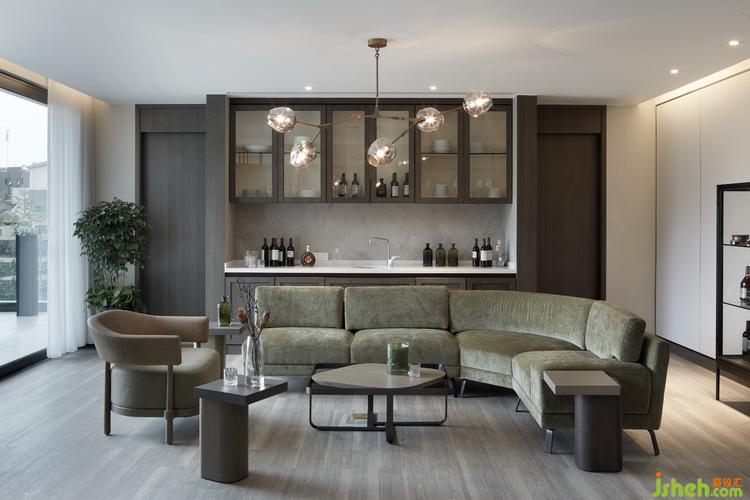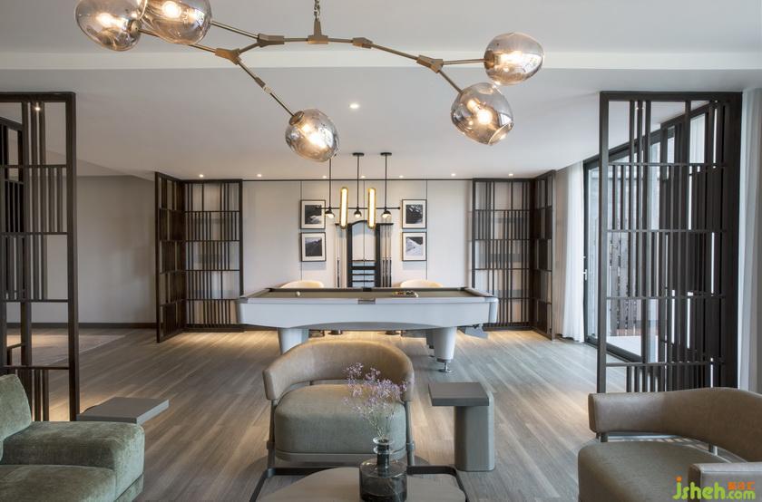 Entering the kitchen area by getting through the screen, the dark wood color kitchen is more like a art gallery that reaching the distinctive art orientation in a low-key silence. Both the artworks on the display case or thegiant landscape painting made by artistic glass increase the thickness of the space. The chandelier rose slowly from the bottom up, improving the visual experience in vertical direction. The wall is in leaf-like dancing artistic device, laying out the flying charm,