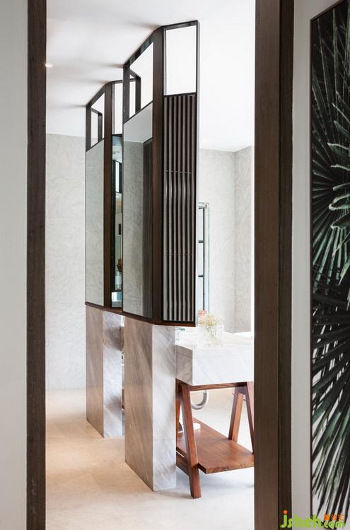 浴室以最少器物的干涉,實(shí)現(xiàn)自然之美的最大承載。迷離的光影,折面鏡將山水風(fēng)光召喚入室,創(chuàng)造靜謐閑逸的度假體驗(yàn)。