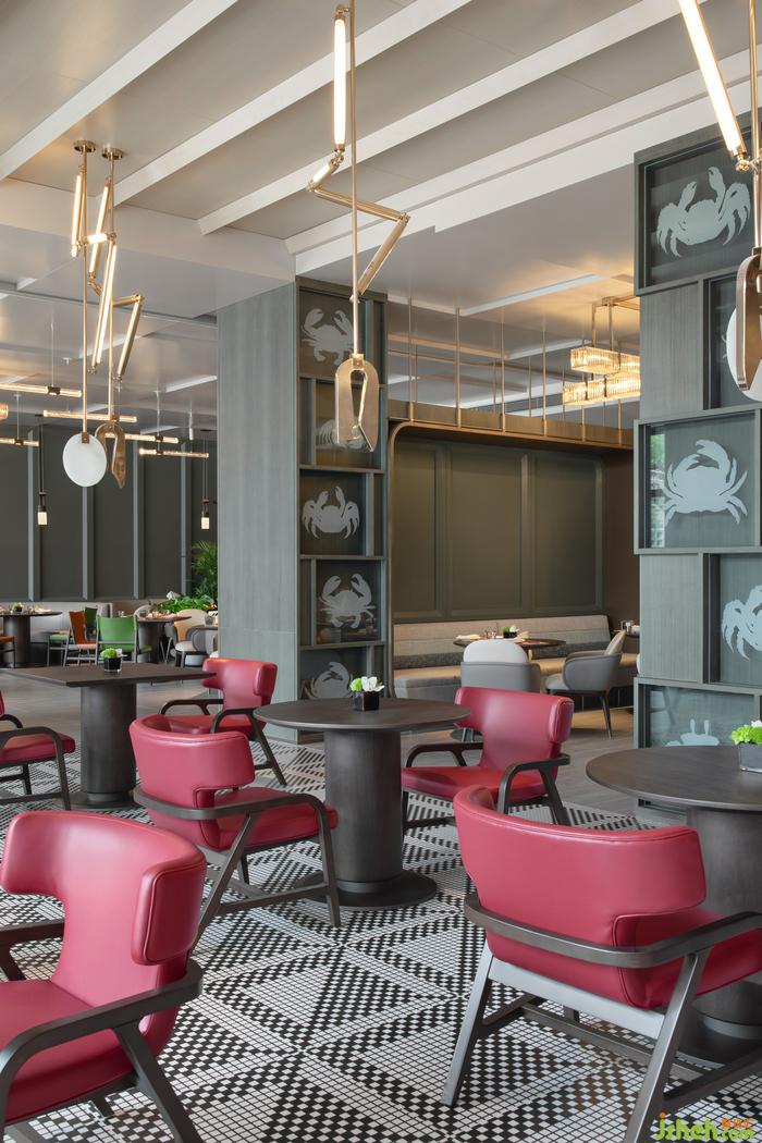 柔和造型的吧臺像湖邊并肩??康拇?,酒店設計以豐饒的蝦蟹食材為主題的特色屏風、螃蟹造型的藝術玻璃相映成趣,一場邂(蟹)宴就此開啟。