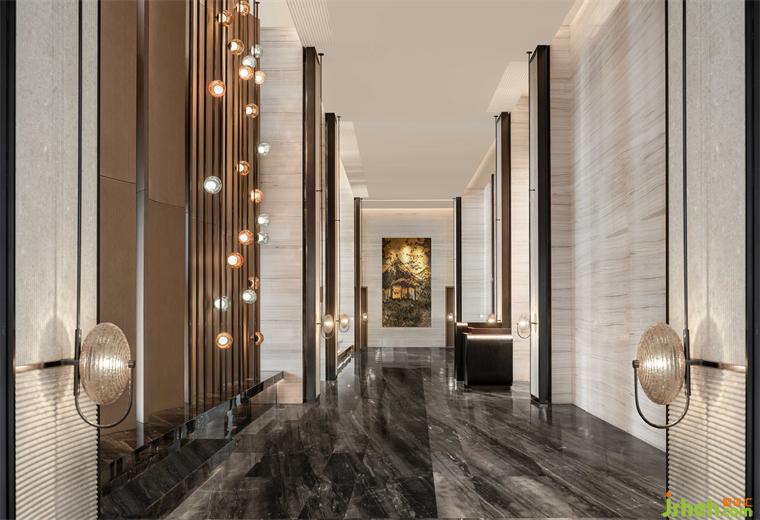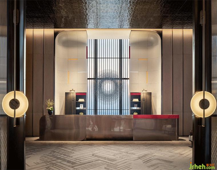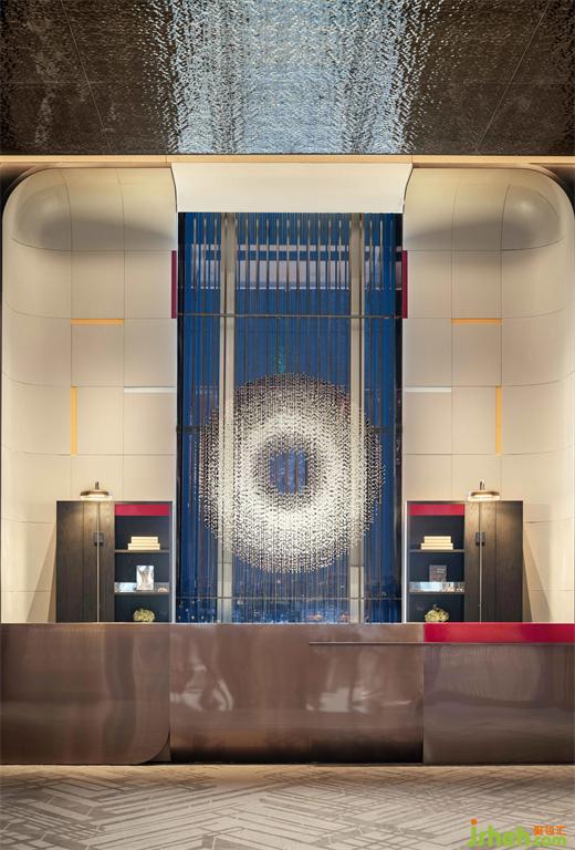 水波紋不銹鋼鏡面天花,于賓客踏入接待區(qū)的瞬間,即產(chǎn)生有趣的對影。酒店設(shè)計(jì)設(shè)計(jì)者對空間的寄望,一一投射于微觀處的精雕細(xì)琢。材質(zhì)考究,光影自成,精致基調(diào)已定,場域一派自在豐盈。
