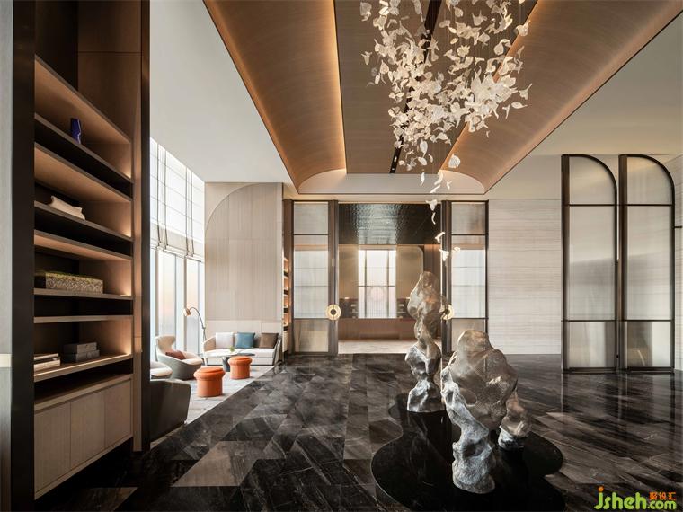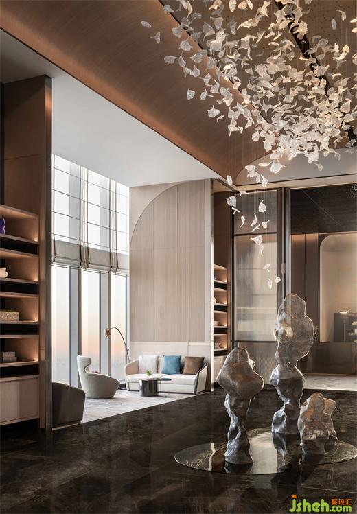 設(shè)置巧妙卻不張揚(yáng)的藝術(shù)品,非空間主角,卻成為勾連時(shí)間與空間的鑰匙。酒店設(shè)計(jì)以泉水取色,以泉眼取形的水晶藝術(shù)裝置,似思緒靈感的怦然迸發(fā),粲然亦奪目;又似可穿梭古今的時(shí)光機(jī),回觀是百載商埠的繁盛浩瀚,展望是當(dāng)代都會(huì)的摩登新潮。