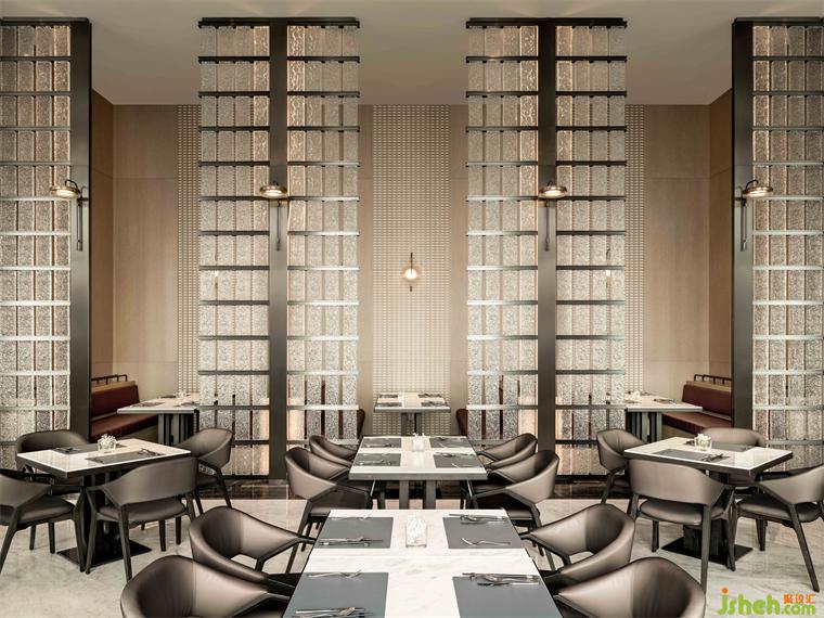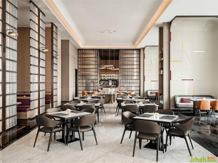 全日餐廳以簡約的筆觸,勾勒無形的豐盈。時光彷彿于精妙的細節(jié)中交疊,從大堂延展至全日餐的陳列架、源自“街燈”形態(tài)的過道壁燈,軟包隔斷墻上似鱗次櫛比店招的錯落亮麗色塊,于可視化的空間中映照出古商埠與新都會交融的圖景和故事。