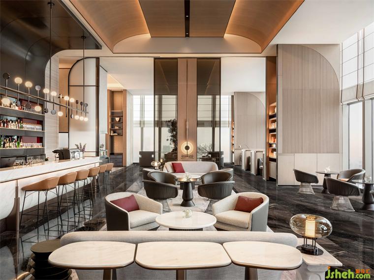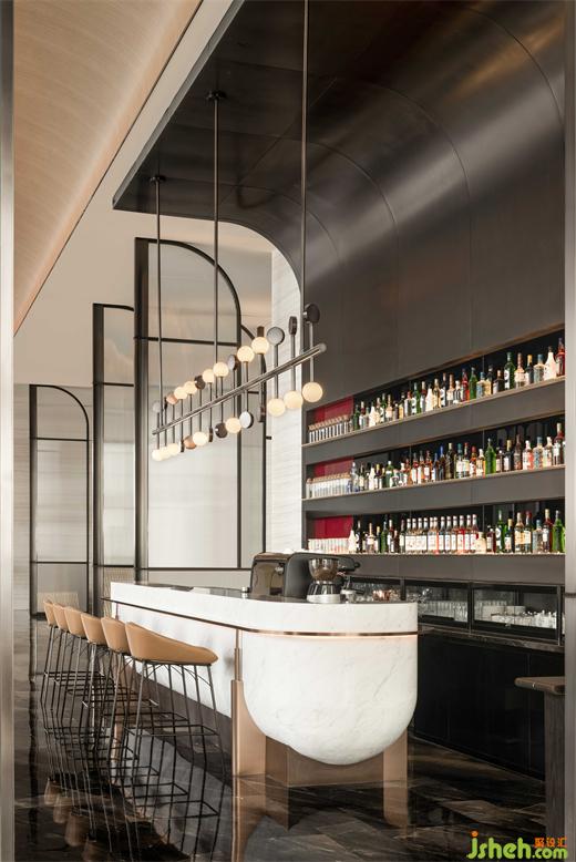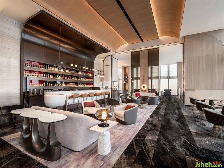 莫道江南遠,江南盡在此間。以江南烏篷船為靈感,酒店設(shè)計從地面延展至頂面的曲面吧臺背景墻,呼應(yīng)頂部天花造型,暖暖燈光傾瀉而出,予人一種暖心的包裹感。