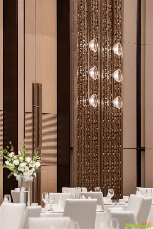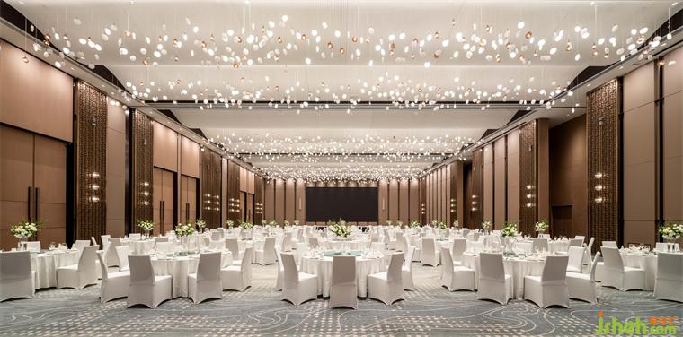 天花波瀾,燈飾起伏,宴會(huì)廳翻涌的波浪天花造型與錯(cuò)落有致的波紋狀圓形燈飾組合,重現(xiàn)了印度詩(shī)哲心中的濟(jì)南盛景。粼粼泉水,映射眼前,燈光乍亮,大者如珠,小者如璣,酒店設(shè)計(jì)仿若泉涌,靈動(dòng)萬千。