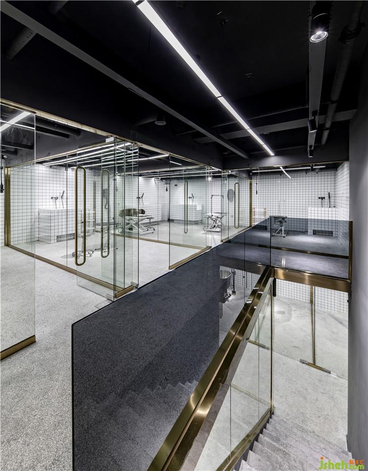 地下一層的洗寵區(qū)域,是“圍”與“透”的巧妙結(jié)合,透明的玻璃使整個(gè)空間既相對(duì)獨(dú)立,又完美契合。同時(shí),采用白色墻磚結(jié)合燈光效果,即使是地下空間也最大程度的保留了明亮感與通透感。