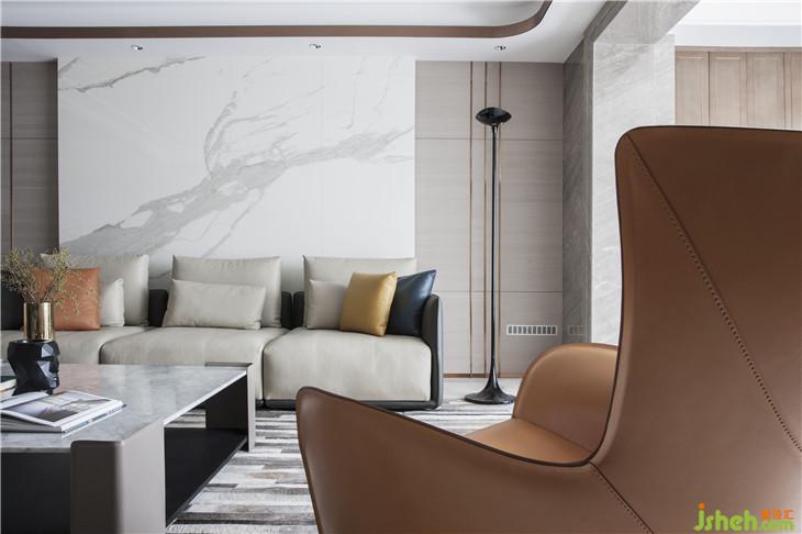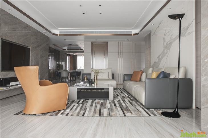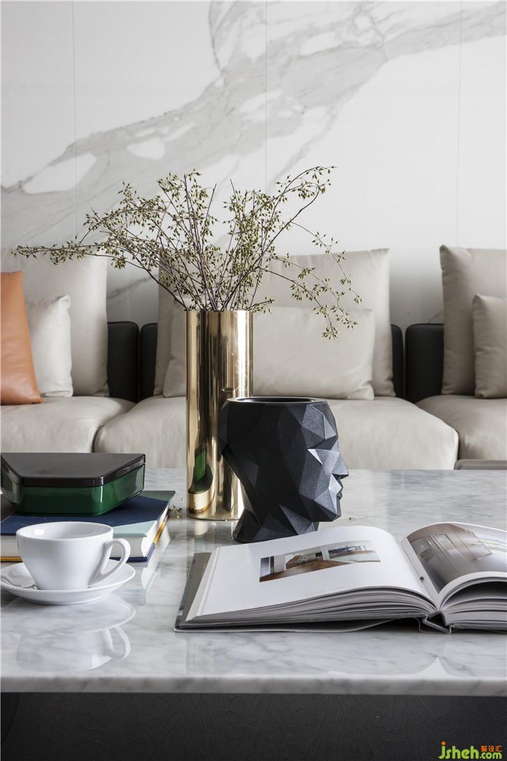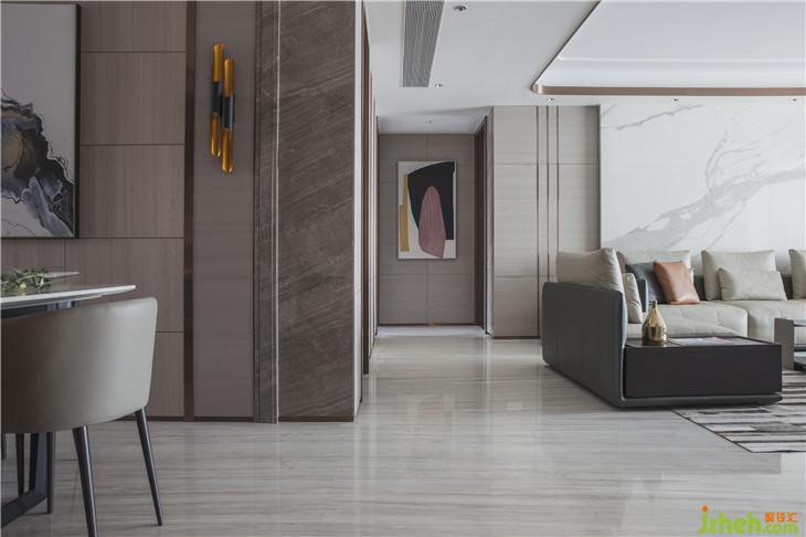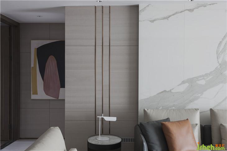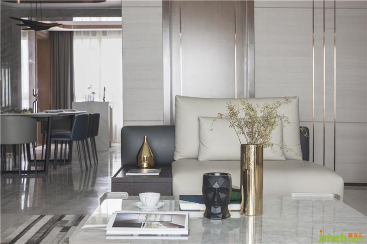 “真正的品質(zhì)生活,期待的是心靈的放松與沉淀,不適合過多的贅述?!痹O計師以此出發(fā),選擇了不爭不搶卻讓人無法忽視的高級灰為主色調(diào),在選材上,巧妙運用內(nèi)嵌黃銅裝飾勾勒輕奢質(zhì)感,并借皮革、大理石、黃銅金屬等多種材質(zhì)的碰撞,營造輕盈而豐盛的基調(diào)。