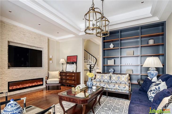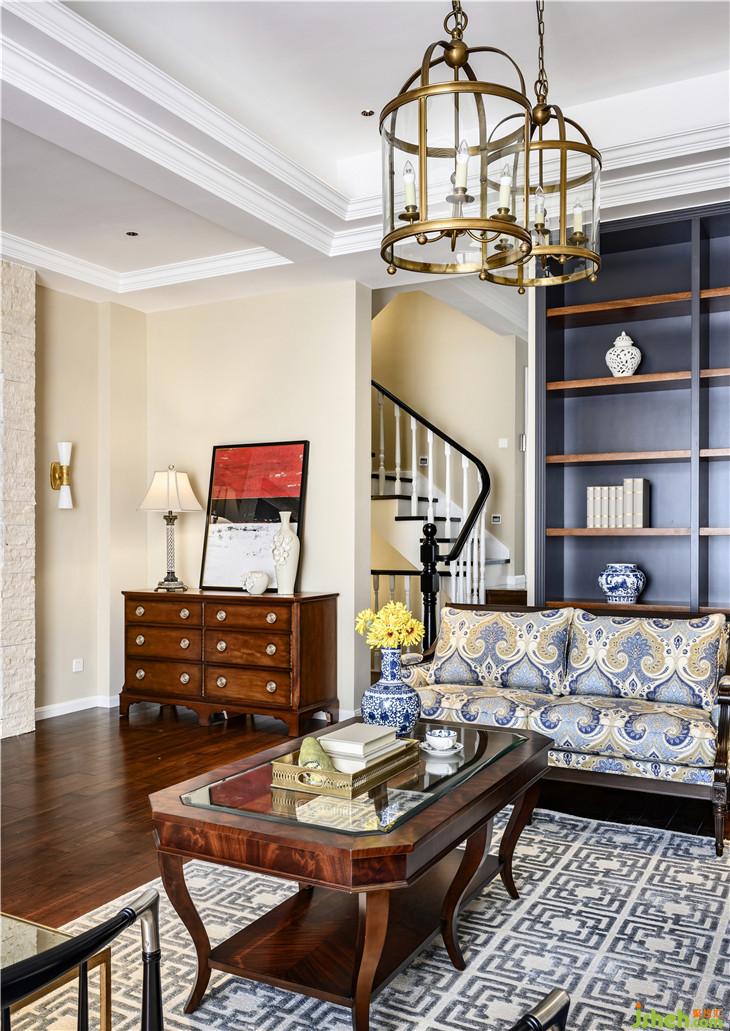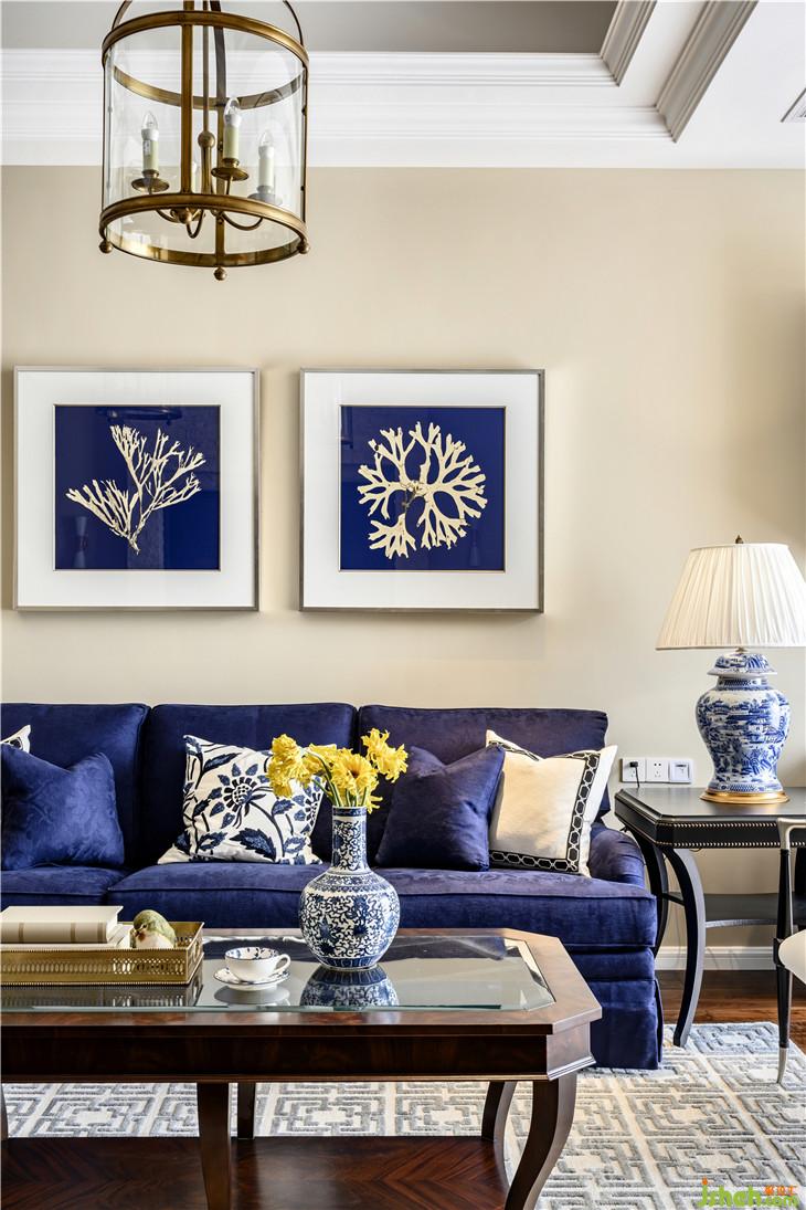 色彩上,寧靜且富有質(zhì)感的灰藍占據(jù)C位,搭配美式家具、復(fù)古造型的吊燈,將空間內(nèi)斂而深刻的美式奢華與優(yōu)雅情調(diào)延展開來。