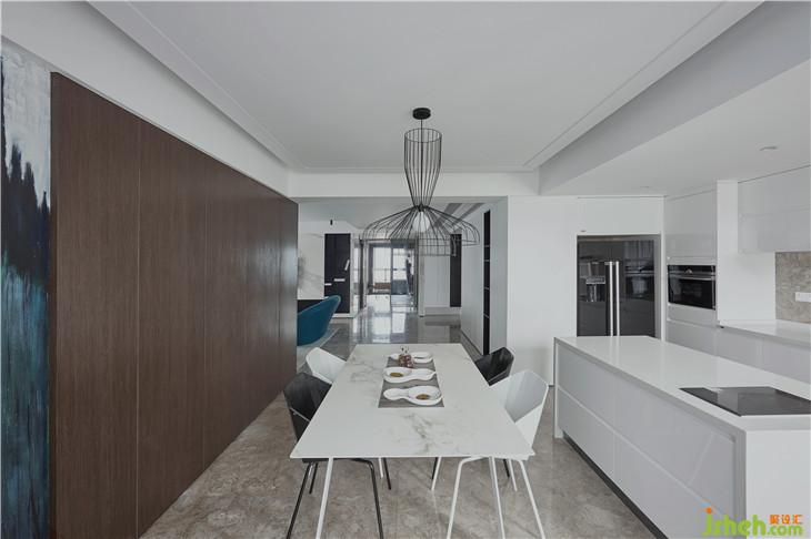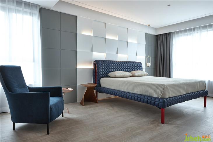 同樣的色彩組合在臥室呈現(xiàn)出沉靜洗練的質(zhì)感體驗(yàn)。多面飄窗,讓居者、空間與光無(wú)阻礙對(duì)話(huà)。極簡(jiǎn)燈飾的不對(duì)稱(chēng)搭配,獨(dú)特造型的背景墻,打破了空間的單調(diào)感,動(dòng)靜之間的微妙平衡將空間品質(zhì)彰顯的淋漓盡致。