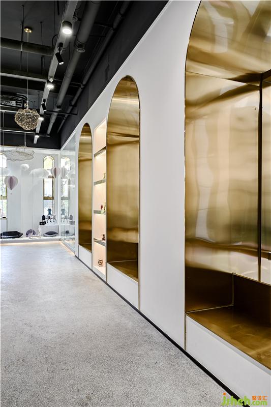 大面積的留白中,材質(zhì)本身的特質(zhì)被充分發(fā)揮出來。展示櫥窗玻璃和金屬元素的組合,地面以統(tǒng)一的水磨石鋪貼,配合頂部的云狀吊燈點(diǎn)綴,在極簡的美學(xué)語境中催生出了浪漫、精致的個(gè)性。