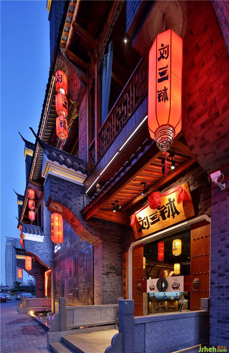 在整個空間中,通過利用空間布局的方式,將就餐區(qū)分為多個空間,并賦予每個空間獨特的文化屬性,使當?shù)匚幕谡w空間中進行融合與統(tǒng)一。同時通過造景的方式將室內(nèi)營造出室外空間的感覺,利用燈光的設(shè)計進行氛圍的體現(xiàn)。外立面則運用了大量燈籠裝飾的概念,喜慶古典的紅燈籠串聯(lián)起來給這個建筑增添更多古色古香的元素。當夜幕降臨后,半透明自發(fā)光的燈籠模樣也在眾多商業(yè)店面脫穎而出。一、二樓大廳也采用了傳統(tǒng)文化的物件之一燈籠裝飾,使得內(nèi)外的空間軟裝元素相融合,燈籠上帶著獨特的店內(nèi)主打菜品的名稱設(shè)計,通過光與影的結(jié)合,闡述餐廳靜謐而內(nèi)斂的美,也為客人留下了深刻印象的重要標志。