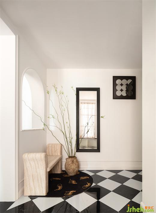 于是從對(duì)于光與空間的感受入手,廣州復(fù)式設(shè)計(jì)通過空間連通嘗試讓玄關(guān)變得通透,左側(cè)墻體做成玻璃窗格采光,加上正面的墻洞形成了前框后景的設(shè)計(jì)。相信流通的空氣與光線足夠活躍心情,裝修設(shè)計(jì)將進(jìn)入者在空間高度方面的注意力轉(zhuǎn)移到四周,建立視覺引導(dǎo)。另外在玄關(guān)左側(cè)窗格也設(shè)計(jì)了隱藏的鞋柜,成為兼顧美感與實(shí)用的一個(gè)空間。