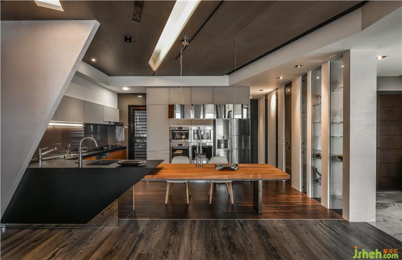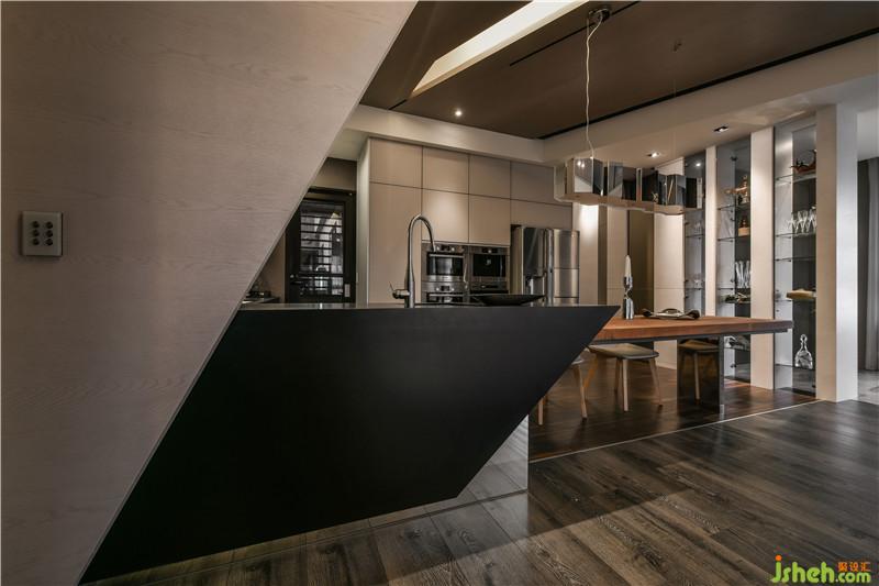 懸浮的餐桌量體,以精密的計算鑲嵌于造型吧臺中,讓餐櫥空間成為一系列流動線條的延續(xù),放大了整體的空間感;配色、材質(zhì)與造型的相互搭配,結(jié)合了展示、收納、起居與創(chuàng)造性的空間關(guān)系,亦為屋內(nèi)迎來了各種超現(xiàn)實色彩的重力感受。藉由曲度、折線、面材對比,打造出具有流動感與故事性的居家空間。