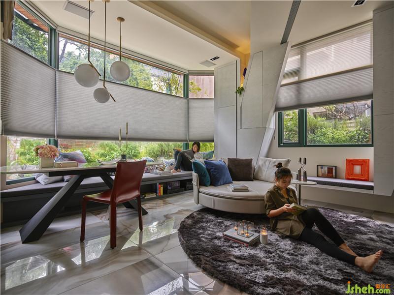 在小坪數(shù)的空間置入鋼琴,將它視為公共空間的主體,作為串連客餐廳與廚房的角色,進而達到場域的開放流動性;針對客廳部分,打破舊有常規(guī),以彈性的座椅模式呈現(xiàn),與窗外造景互相對話,引景入內,讓綠意在室內游走;將餐桌移至窗邊,形塑一種在田園用餐的愜意氛圍,也圍塑出客餐廳的共享感,藉此加大活動范圍的錯覺。天花板的延續(xù)及燈光配置看似只是造型的一環(huán),但整個空間其實有著強大的收納功能,將興趣與生活做完美連結。