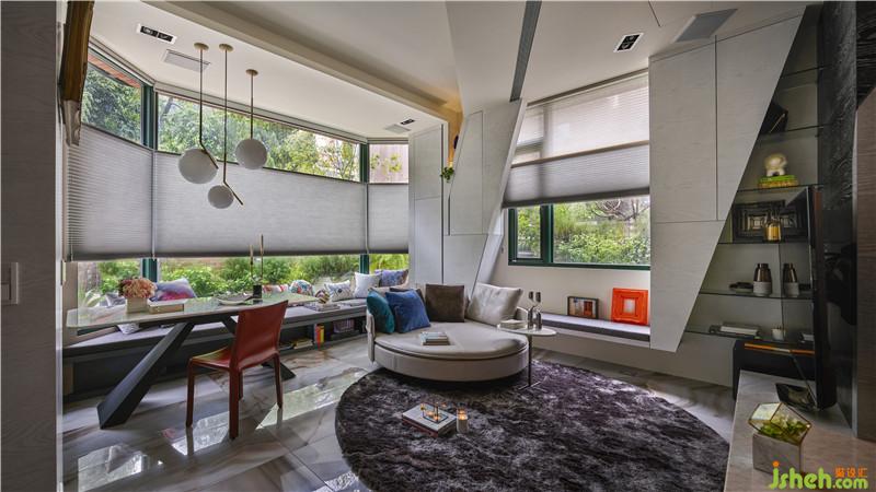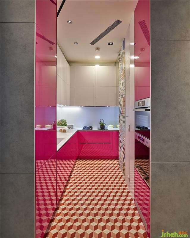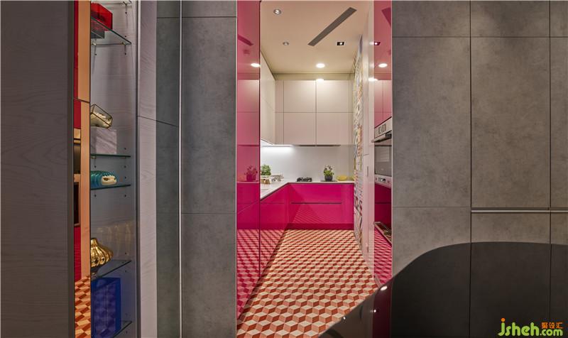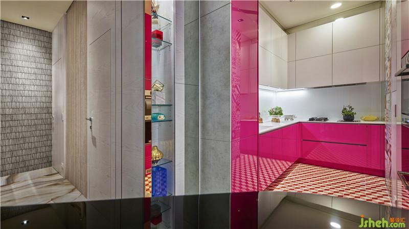 色彩搭配上以大地綠色調作為基底,再層層堆棧豐富色彩,創(chuàng)造獨特且具有內涵的空間層次。廚房則選用女人對料理熱情的桃紅色,顏色飽滿,平衡了兩側水泥柜體的原始質感,彷彿是在一片灰色之中拉開繽紛世界的入口般絢爛,十分具有藝術張力。而主臥講求穿透調性,已大量弧形圍壁營造包圍意象,用紅色的熱情灰色的沉穩(wěn)述說的一抹法式復古懷舊感,色彩及造型的深厚底蘊設計,交織出了令人驚艷的小宅佳作。