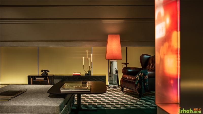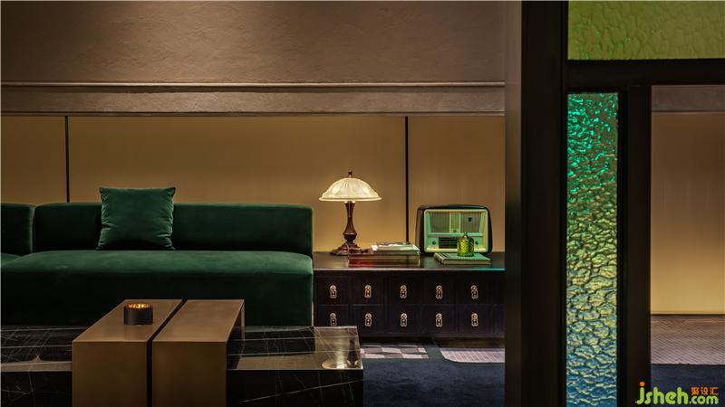 設計師劉榮祿先生奔走于上海、南京、沈陽考察民國時期建筑,沉潛數日,畫出手稿,萃取一組非對稱、幾何形的裝飾線條原型,作為空間最深沉的設計語匯。把歷史底蘊抽取出最原汁原味的部分,每一塊地毯圖案專門定制,立體棋盤格、放射光芒或半圓形色譜,都是Art Deco時代的經典符號。