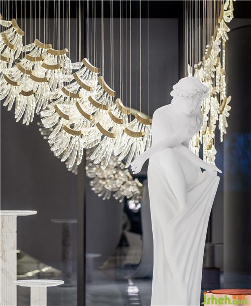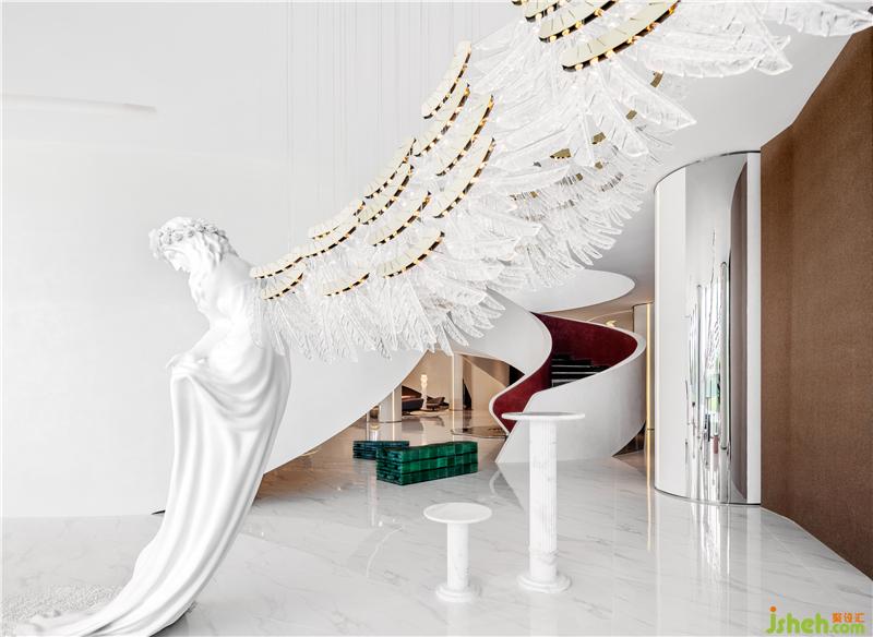 曠遠(yuǎn)的空間內(nèi)天使降臨,矩陣式燈帶自空中垂直而下如天使綻開的雙翼,感性的溫度柔化理性的空間,為宇宙浩瀚的詩意闡發(fā)出無限哲思,讓藝術(shù)的力量豐盈空間氣韻。突破次元的超現(xiàn)實(shí)感,一如《三體》文明中地球人夢境與潛意識的畫面拼貼,透凈且流暢的空間形態(tài),構(gòu)成超現(xiàn)實(shí)的錯(cuò)置感,步入其中內(nèi)心奇妙卻安定。仿佛唯有柔美靈動(dòng)的力量,方可撼動(dòng)堅(jiān)硬的鋼筋混泥土。