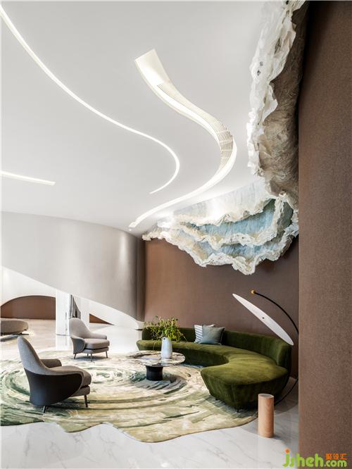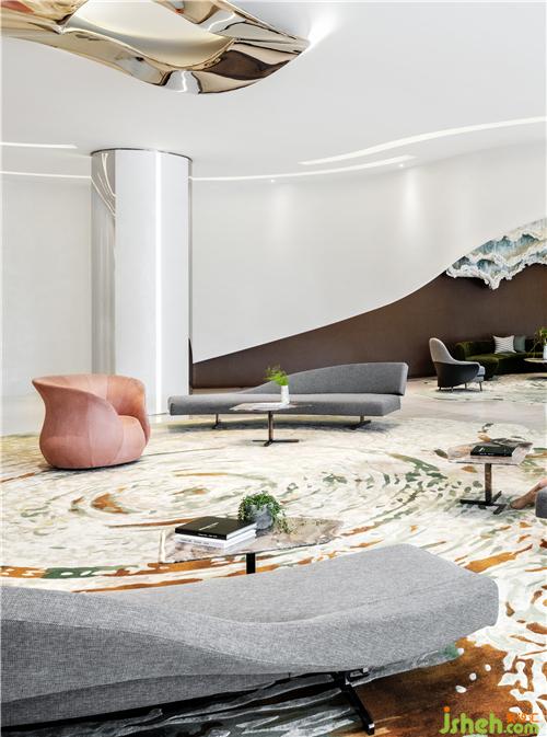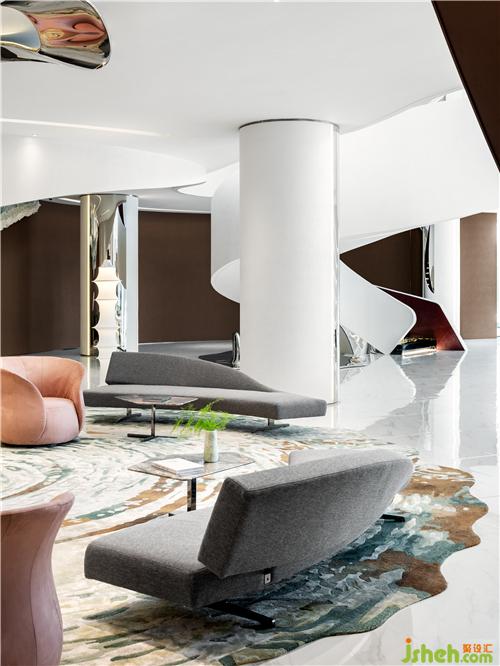 無規(guī)則綠紋地毯如池塘微動(dòng),在澄凈白練的空間變化出水波漾漾的虛空幻境。幾只橡皮粉鹿皮絨單人椅,如似開未綻的朵朵粉荷立于水塘之上。布藝灰色長條沙發(fā),如洗練的石塊靜靜匍匐于荷塘水面。一高一矮與空間形成微妙的對話關(guān)系,又如一塵未沾的未來世界,夢幻而又充滿現(xiàn)實(shí)感。
