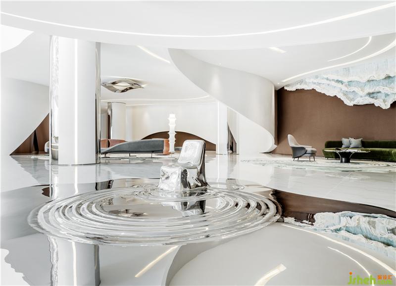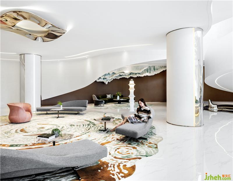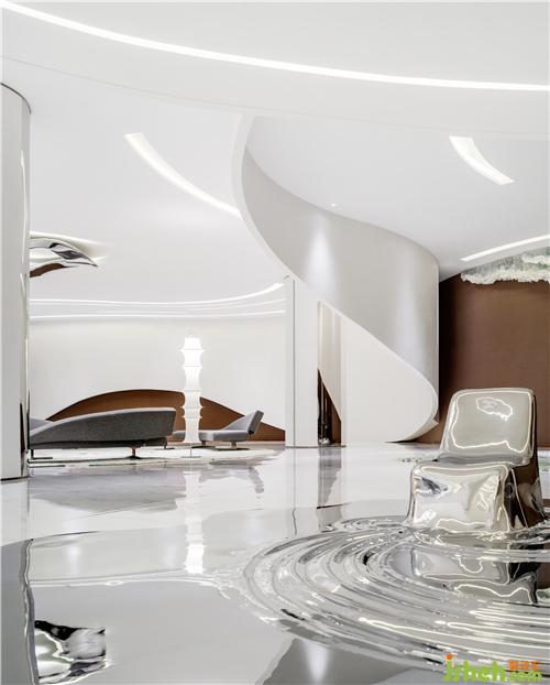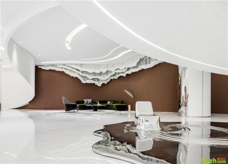 踏入洽談區(qū),時(shí)間靜止的魔力撲面而來,以「宇宙:引力、自轉(zhuǎn)、公轉(zhuǎn)」為設(shè)計(jì)主軸的美學(xué)闊值,引出杭州水脈形上的玄想,藉由想象創(chuàng)造一個(gè)擁有無限可能的空間。