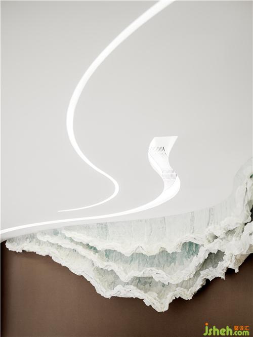 書吧區(qū)靜處一隅,勾畫出一個好似《冰河世紀》般巨大的冰川溶洞中新生的文明世界,又如《侏羅紀公園》模擬而成的遠古地殼運動誕生物,宏大而遙遠。沿墻體一側(cè)自然剖開的流體空間,將每本關(guān)于文明的記載一一陳列期間,強化空間的虛實關(guān)系,似有似無間延伸空間縱深感。