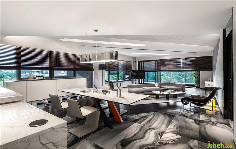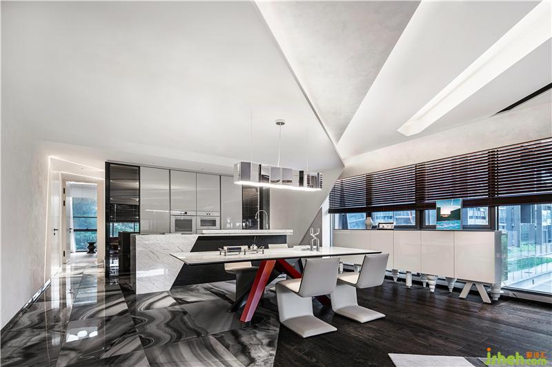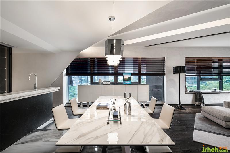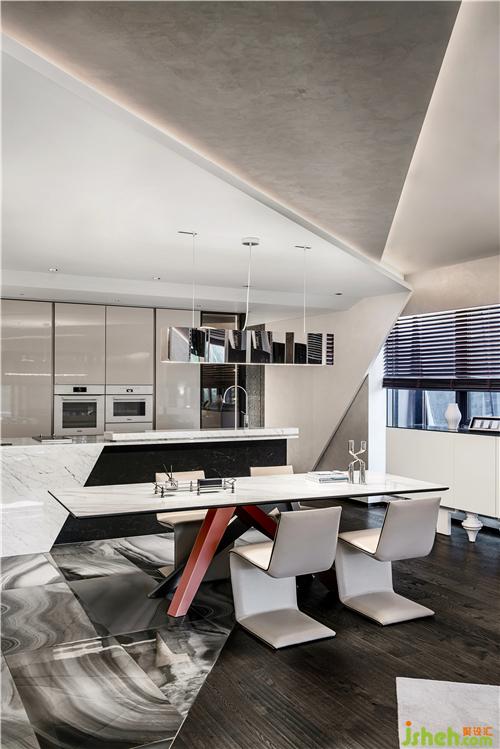 從地面、墻面、天花板延伸而來的線條形構(gòu)的三維空間內(nèi),白色大理石懸浮感餐桌與3D科技感十足的燈飾,在柔和的光帶組織和光影變幻下綿延出開闊的空間意境。