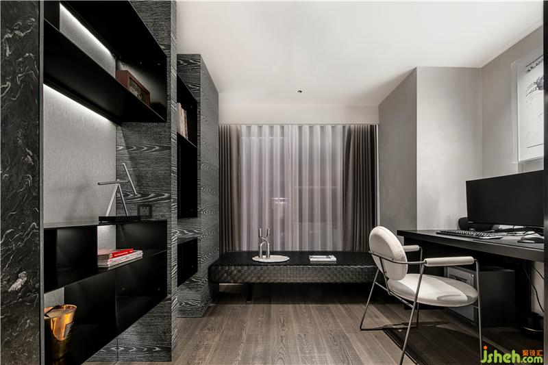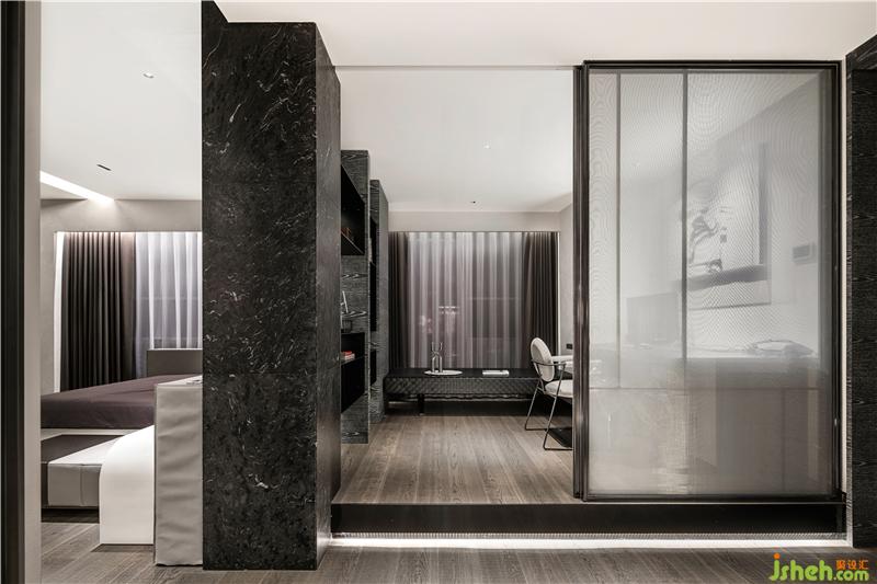 紗紋移門隱隱綽綽的設(shè)計,若隱若現(xiàn)為臥室分立出一塊獨立的書房空間,色調(diào)高級的黑色大理石與仿木紋飾面、淺灰色布藝組合,深圳豪宅設(shè)計氤氳一處極具藝術(shù)氣息的場域.