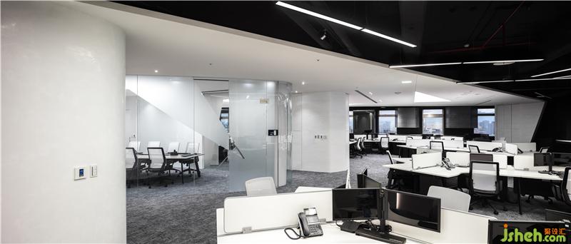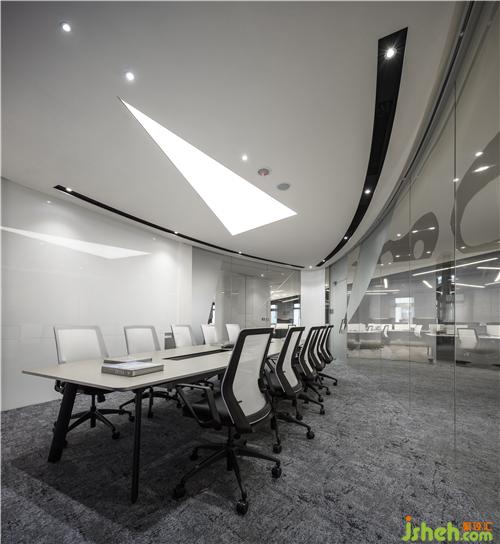 在有限的真實世界里營造出無限的空間感,一個虛擬的精神世界在幾何造型的層層鋪陳下徐徐展開。線條疊合、旋轉(zhuǎn),使空間進(jìn)行組合,實現(xiàn)了場地平面細(xì)分和尺度控制,辦公室設(shè)計將透明弧形玻璃圍合的會議室安排在辦公空間的心臟部位,使訪客員工都能最快進(jìn)入,形成了一個靈動而富于變化的“洄游式空間”。