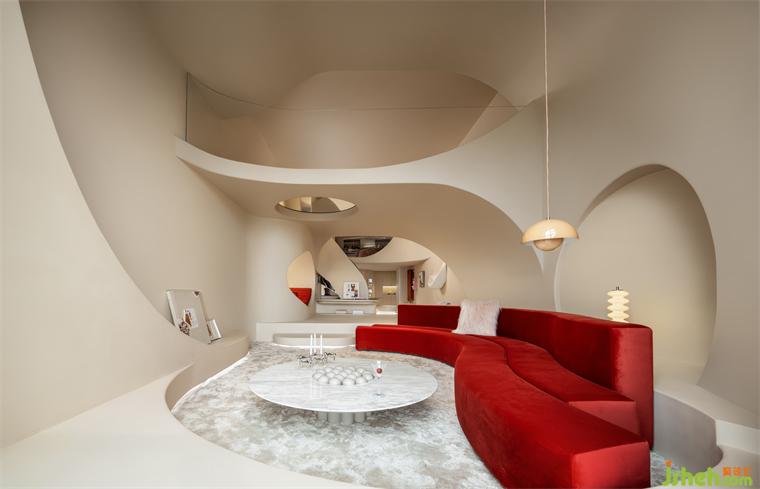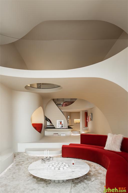樣板房設(shè)計(jì)弧形沙發(fā)自帶慵懶閑逸的氣氛,或隨意依靠或席地而坐。圓形玻璃在這里繼續(xù)充當(dāng)一二樓之間的功能劃界與情緒脈連,透而不通,聚而不合,為空間憑添獨(dú)特的節(jié)奏感與美學(xué)張力。