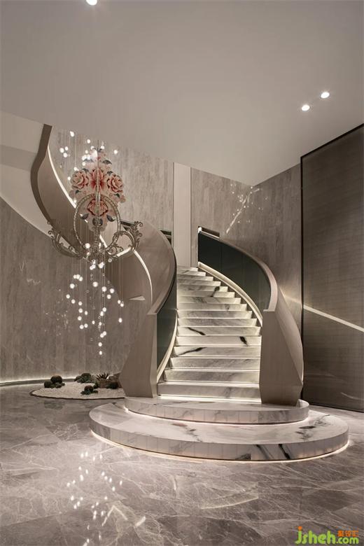 旋轉(zhuǎn)樓梯中央吊燈形式以發(fā)簪為設(shè)計(jì)發(fā)散,藝術(shù)化處理將花元素通過(guò)紙雕花藝來(lái)表達(dá),售樓處設(shè)計(jì)以旦角精致華美的發(fā)簪為設(shè)計(jì)發(fā)散,將發(fā)簪主體通過(guò)金屬來(lái)構(gòu)造,在尾部用水晶作為點(diǎn)綴。
