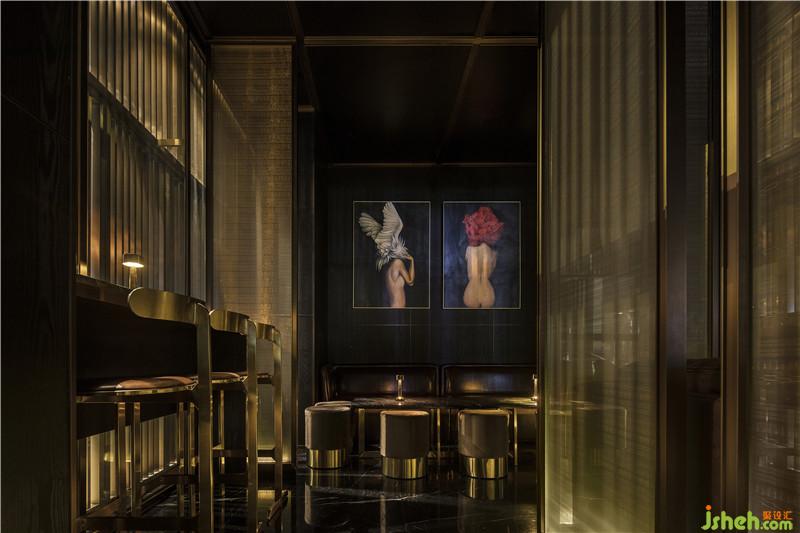 整個空間以黑色為背景,隱含著夜店的本色,也蘊(yùn)含著能量聚集的概念。其間以金色作點(diǎn)綴彰顯威士忌酒吧的高品質(zhì)和輕奢感。