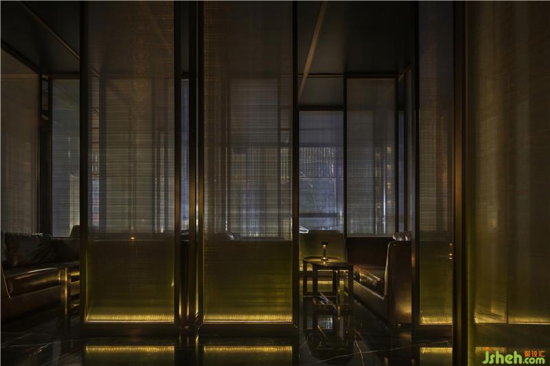 本次設(shè)計運(yùn)用了不銹鋼電鍍仿銅邊框,運(yùn)用了內(nèi)含金屬銅拉絲的鋼化夾絲玻璃屏風(fēng)分隔空間。這種半透明的屏風(fēng)無形之中使得整個空間形成了不同層次的透疊效果??臻g“虛”中有“實(shí)”,“實(shí)”中有“虛”,“虛虛實(shí)實(shí)”相得益彰,讓進(jìn)入FITCLUB的每位客人都有種若隱若現(xiàn)的東方“朦朧美”。