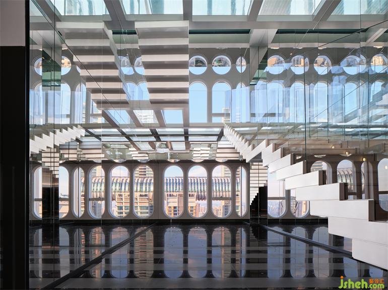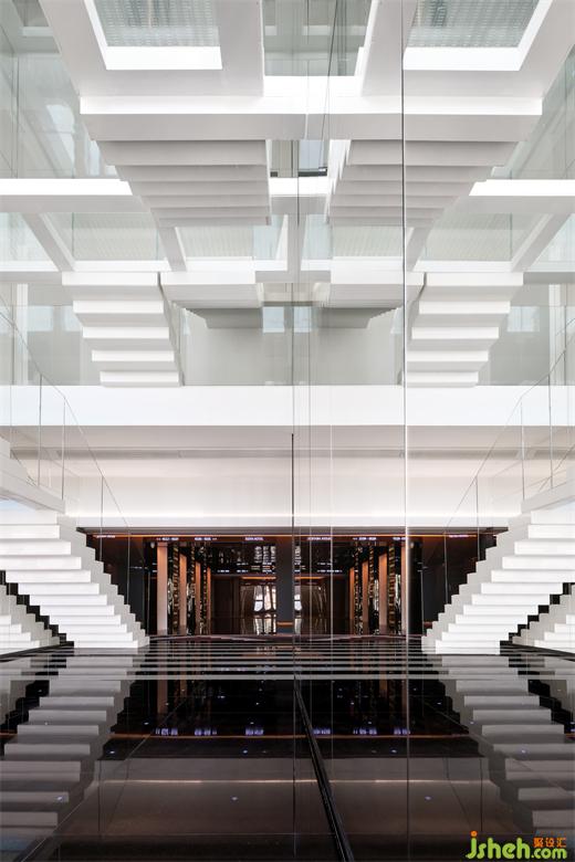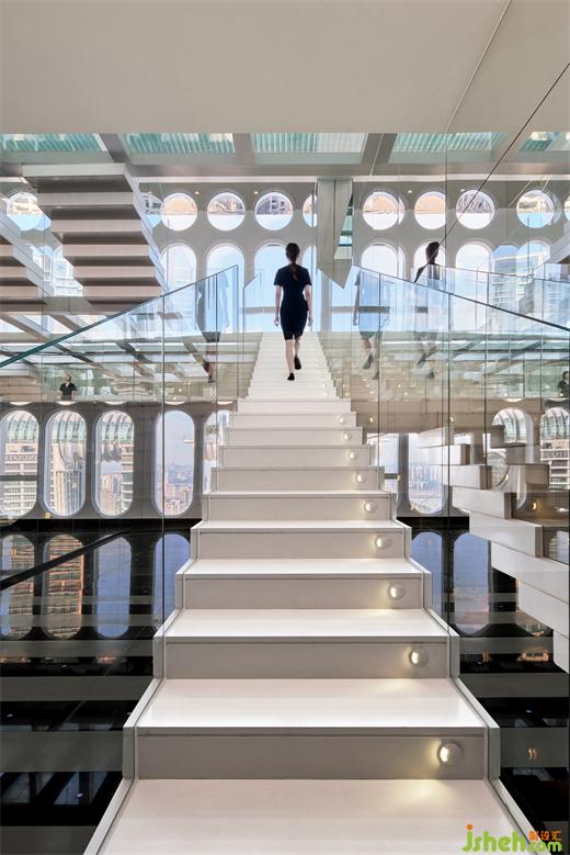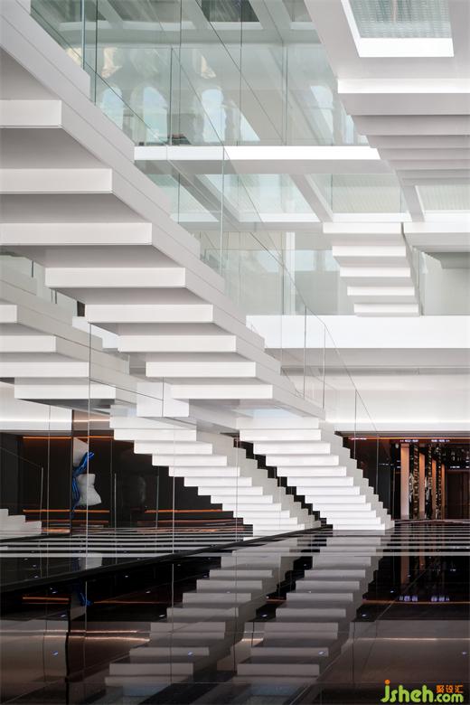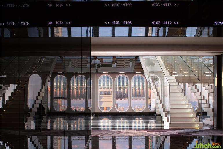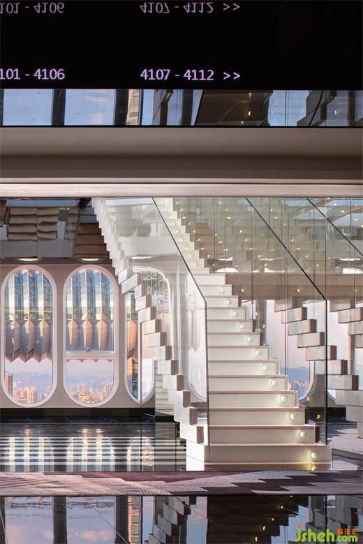 “漂浮”的階梯與來(lái)福士水晶連廊疊印在一起,遠(yuǎn)近,虛實(shí),融合為幻象,失重、游離的感官體驗(yàn)——浮云高空酒店設(shè)計(jì)的基因便是如此。