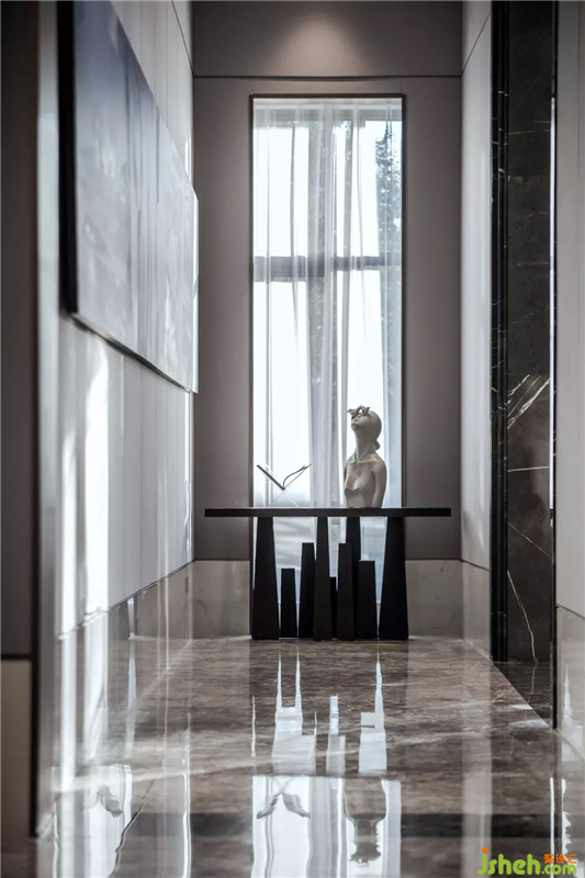 在創(chuàng)作的過程中把建筑作為一種詩(shī)意的想象,滲透抽象在這座當(dāng)代中式人文宅邸,基于【宋 · 歐陽(yáng)修】《醉翁亭記》“風(fēng)霜高潔,水落而石出者,山間之四時(shí)也”的設(shè)計(jì)定位,以詩(shī)之語(yǔ)境,構(gòu)建當(dāng)代東方人文逸美生活典范的設(shè)計(jì)定位,并提取“風(fēng)霜”-“水落”-“石出”-“山間”四個(gè)自然元素為記憶點(diǎn)營(yíng)造空間詩(shī)意的情感氛圍。