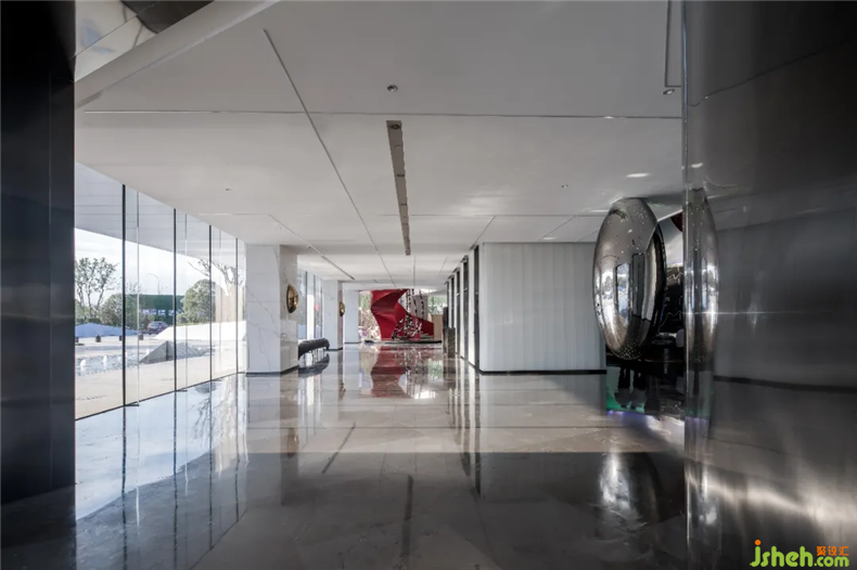 全空間共設(shè)計(jì)21件藝術(shù)品,創(chuàng)造出一個(gè)美術(shù)館般的藝術(shù)空間。紅色樓梯加入科技體驗(yàn),烘托著《海明珠》、《聽裝置》,以智能化的聲、光與空間產(chǎn)生互動(dòng)。