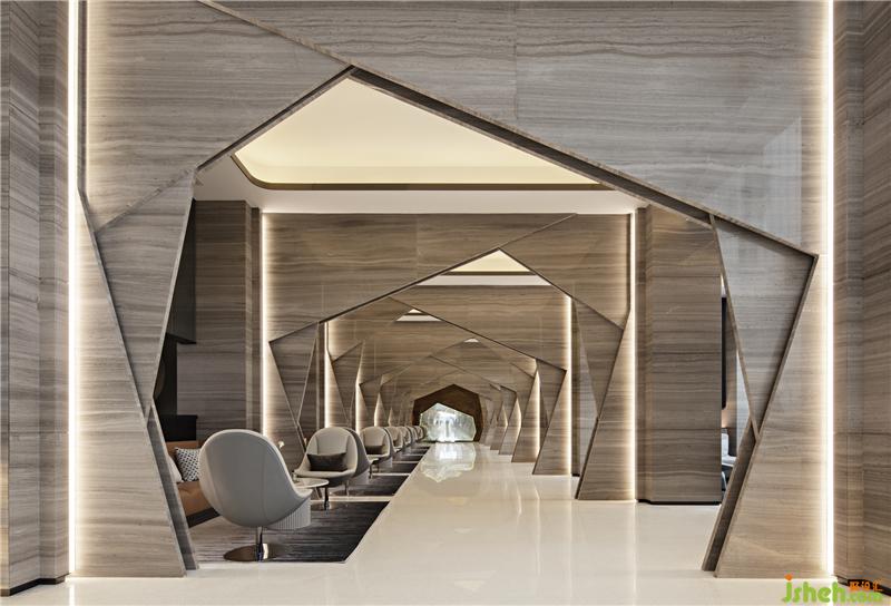 設(shè)計(jì)師大量運(yùn)用石材,不銹鋼金屬收邊,以簡(jiǎn)勝繁,簡(jiǎn)潔之中,凸顯其奢華品質(zhì)。空間的獨(dú)特之處在于幾何形狀的拼接,融合。室內(nèi)設(shè)計(jì)師
