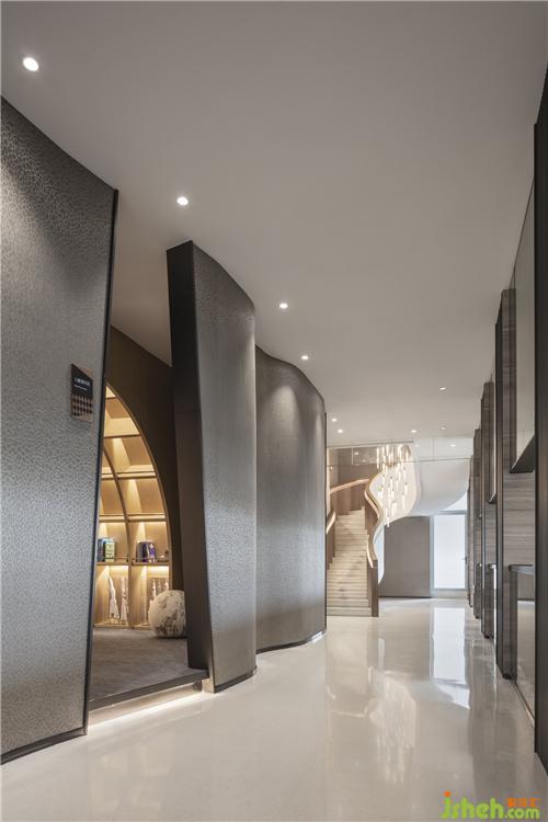 狹長(zhǎng)的空間,配合弧形的墻面,柔軟了空間質(zhì)感。